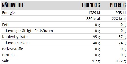 Kartoffelquellstärke, Maltodextrin, Saccharose, Fructose, Kochsalz, Magnesiumcitrat.